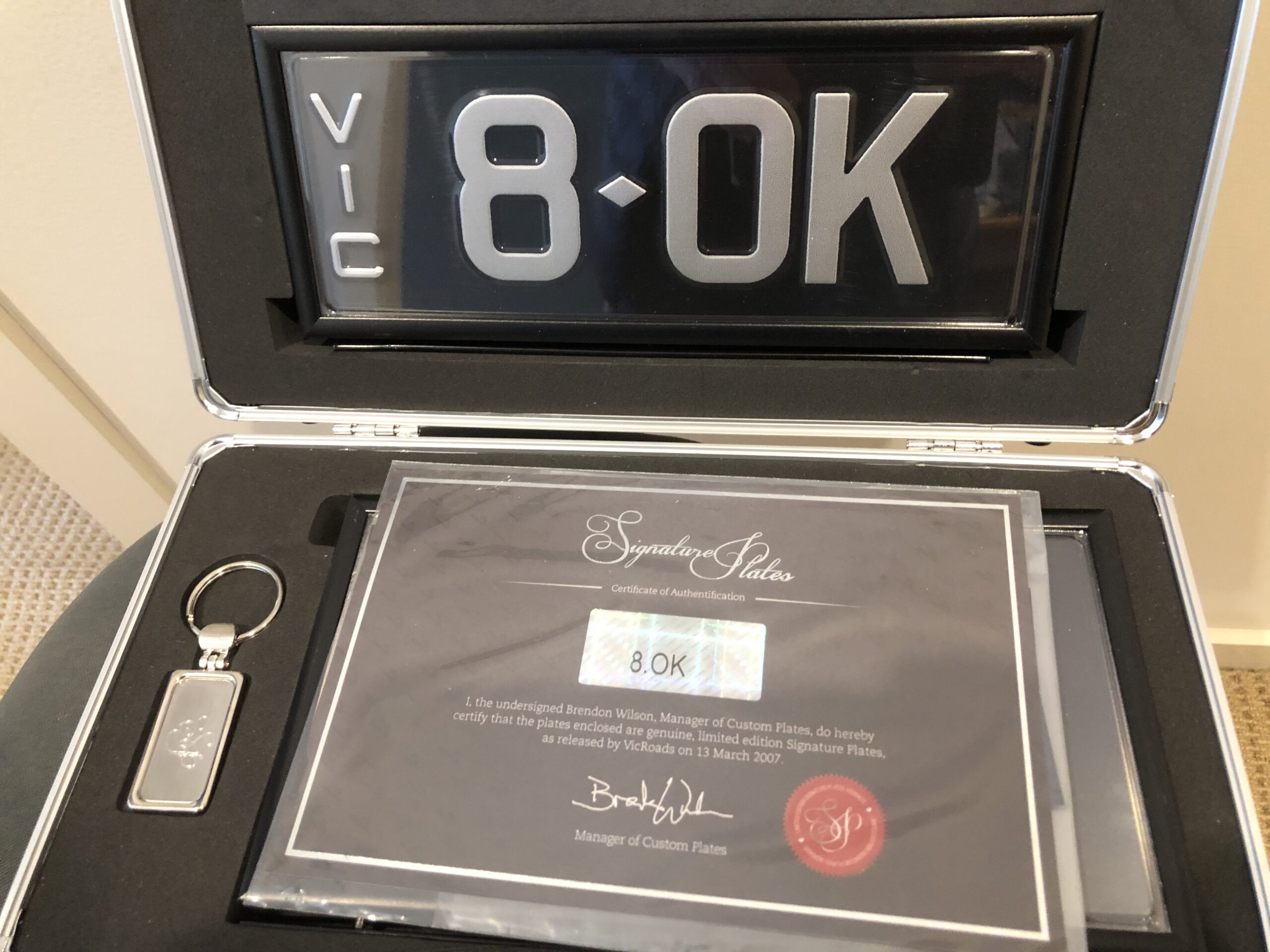 "OK" Team - very cool Signature Plate on offer right here. Apart from this looking magnificent in black and silver, and with perfect spacing between the characters and the diamond, the strong aesthetics are complimented by the strength in characters. The powerful number 8 is accompanied with the term "OK" which implies that this is more than OK - and that is very special, cool and unique.